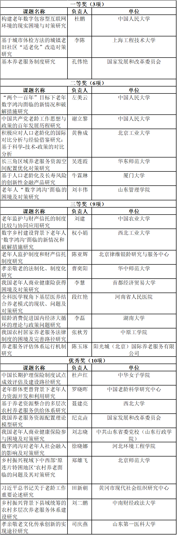经专家委员会评审,本次中国老龄协会2021年度老龄政策理论研究立项课题共评选出一等奖3项、二等奖6项、三等奖9项、优秀奖10项(具体评奖结果见文末)。