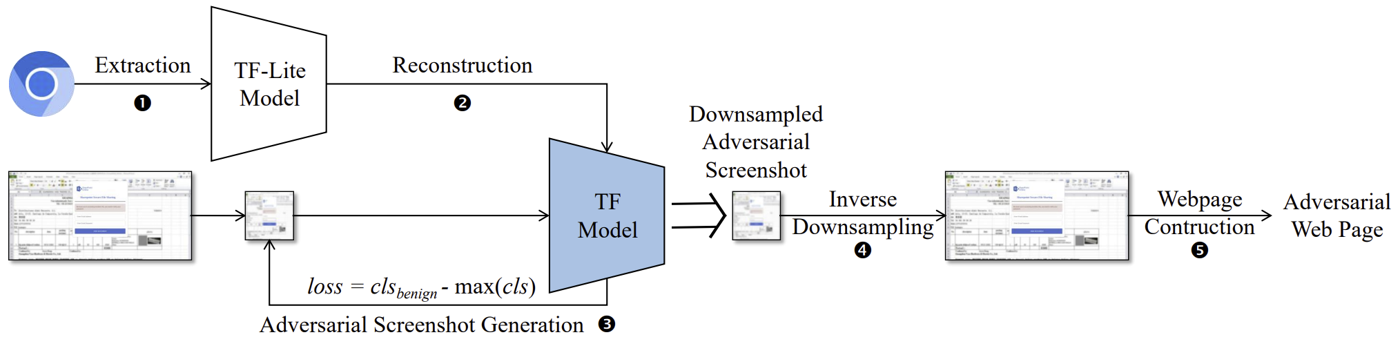钓鱼攻击是最流行的网络空间攻击之一,给个人、企业和组织带来了严重的安全威胁。在钓鱼攻击中,攻击者伪装成知名的实体,例如微软、网飞、亚马逊等,以此获得如用户名、密码和信用卡明细等敏感信息。为了应对这一问题,Google在其Chrome/Chromium浏览器中加入了基于CNN图像分类器的钓鱼网页检测器。该检测器通过网页截图判断一个网页是否是钓鱼网页。
