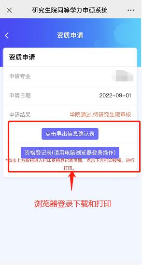 系统信息填写完成后,进入学院审核步骤(6月1日审核完成),学员请于6月2日自行查询资质申请状态为“学院通过,待研究生院审核”即可【点击资格登记表】注意使用浏览器登录,再进行【点击导出信息确认表】(操作步骤如下图)