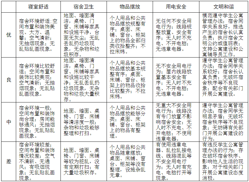 同时,宿舍卫生总评也将进入优秀班级评比参考因素。对于宿舍卫生较差且不进行改善的宿舍将通报批评并上报班主任处理。