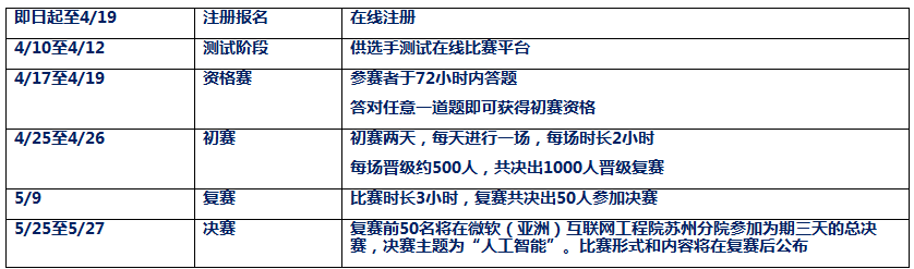 大赛分为资格赛、初赛、复赛和决赛四轮。资格赛、初赛和复赛均在网络比赛平台上举行,均为算法题,并将继续采用hihoCoder和Code Hunt两个不同形式的技术平台。决赛将以现场比赛的方式在微软(亚洲)互联网工程院苏州分院举行。