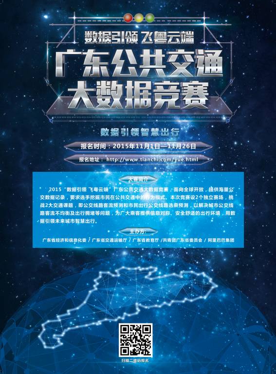 2015“数据引领 飞粤云端”广东公共交通大数据竞赛,由广东省经济和信息化委、广东省交通运输厅、广东省教育厅、共青团广东省委员会、阿里巴巴集团联合主办,在“天池大数据众智平台”上开展的高端算法竞赛。