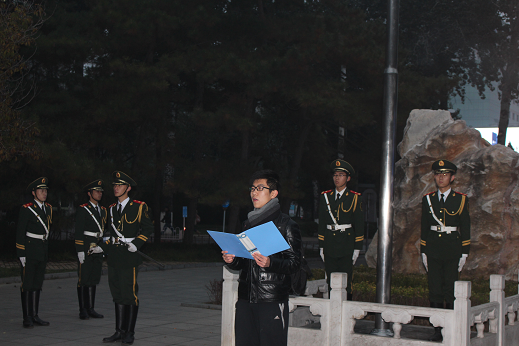 6:40,同学们在求是园有序列队集合。6:55,升旗仪式正式开始。首先,由bat365在线平台登录武警国防生国旗护卫队的队员向同学们做《国旗法》知识宣讲,号召同学们以实际行动爱护、尊重、捍卫国旗。宣讲完毕后,国旗护卫队的国防生同学们迈着矫健的步伐入场,铿锵有力的脚步声响彻求是园。五星红旗伴着雄壮的《义勇军进行曲》缓缓上升,同学们庄严肃立,向国旗行注目礼。天气虽然寒冷,仍挡不住同学们心中激荡的爱国情怀!