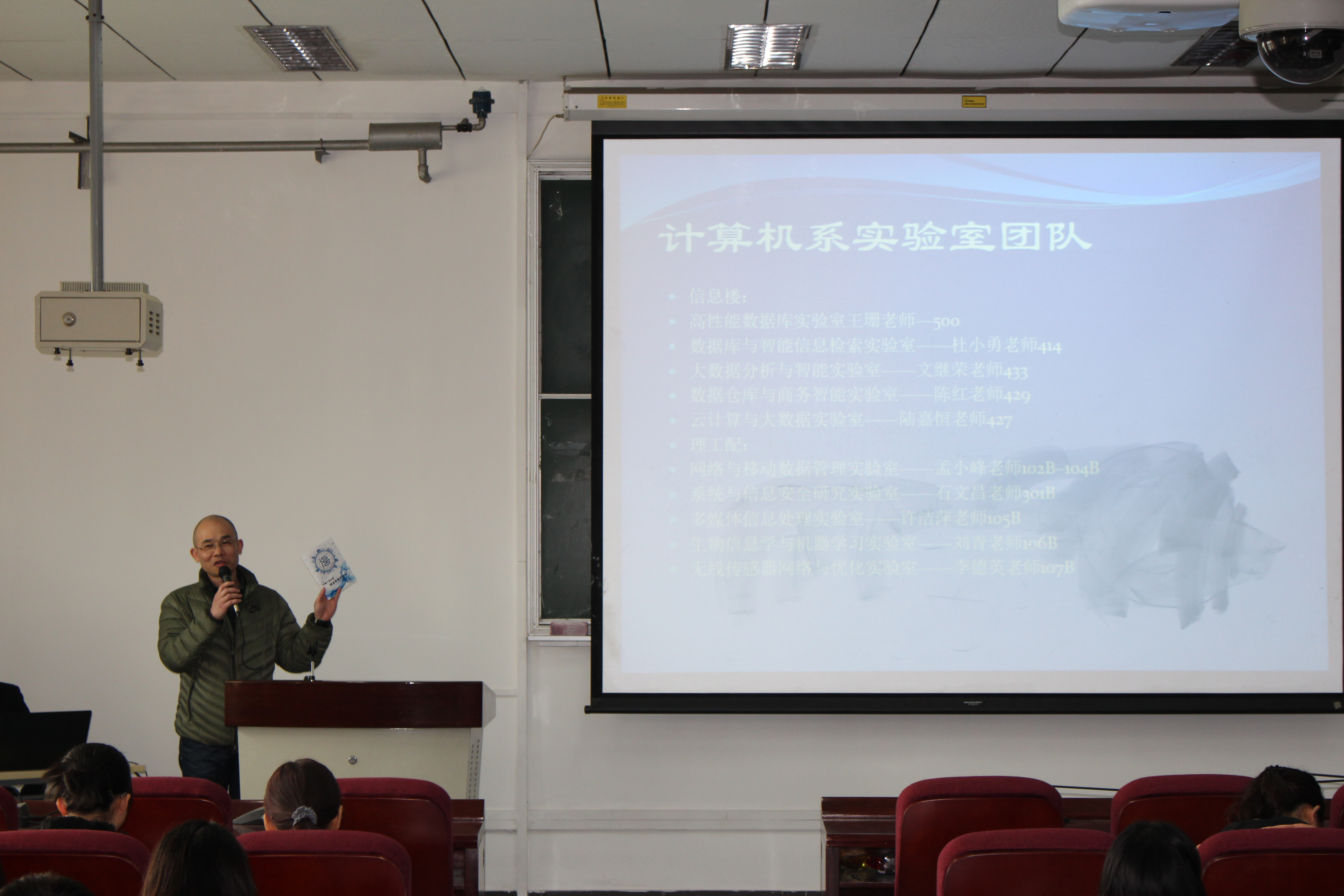 下午1点40分,活动在信息楼四楼报告厅正式开始。计算机系主任石文昌教授进行学系总体介绍,与大家分享了计算机系的历史、现状与目标,又对全系十个重点实验室做了简单的介绍。部分实验室负责老师也对同学们进行了介绍和展示。DBIIR实验室的陈跃国老师,简要介绍了由杜小勇院长带领的数据库与智能信息检索团队并现场进行了系统演示;大数据分析与智能实验室的负责老师文继荣教授,带领大家了解了时代新兴的大数据的内涵和重要意义。