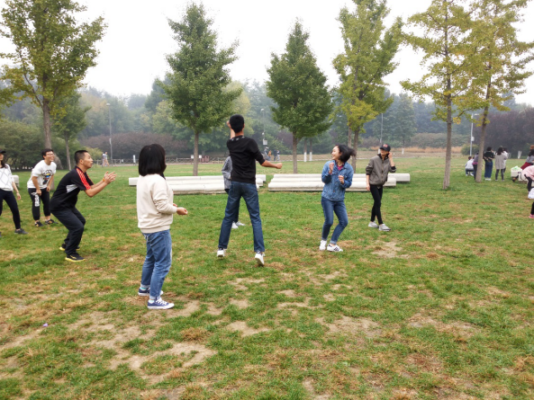 临近10点钟,同学们从公园各处集合到公园中的一处草坪空地。同学们打破陌生的隔阂,共同参加到游戏环节中,场面活泼多趣,气氛融洽欢乐。“一元五角”游戏中,大家全神贯注听主持人口令迅速抱团,“抢人大战”多次爆发,游戏进入白热化状态,场面十分热烈。经典游戏“扔沙包”时,四个部门分组对抗,新生和高年级同学们齐上阵,大家全心投入游戏,欢声笑语满布现场,纵使有小雨亦是热情不减。