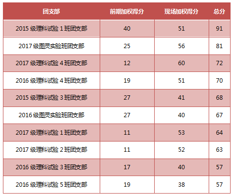 分组展示中,各个团支部各显风采。2016级理科试验4班团支部展示了班级浓厚的学习氛围、丰富的课余生活以及同学们认真刻苦的学习态度。17级理科试验6班团支部汇聚了一群富有文艺情怀的理科生,用一段精彩的视频展示了属于他们的狂热青春。17级图灵班团支部齐心筑梦,在ACM竞赛、数学建模等各项竞赛中取得了优异的成绩。16级理科试验3班团支部以蓬勃的朝气宣告了他们积极学习党团精神、向组织靠拢的决心。17级理科试验5班团支部向大家展示了他们颇有内涵的班徽,17级理科试验2班团支部用诙谐幽默的方式向大家展示了他们严肃活泼的支部活动……