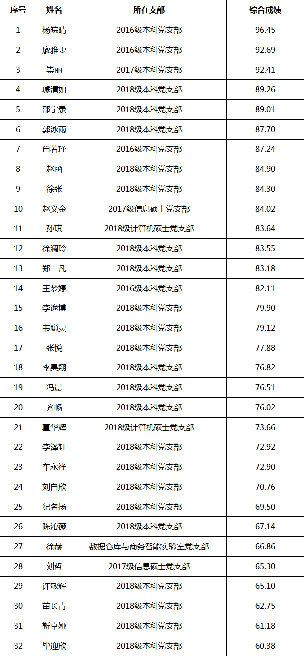 本期党校共有35人通过党校学员资格审查并参加院党校学习,最终32人成绩合格,现将通过名单公示如下。