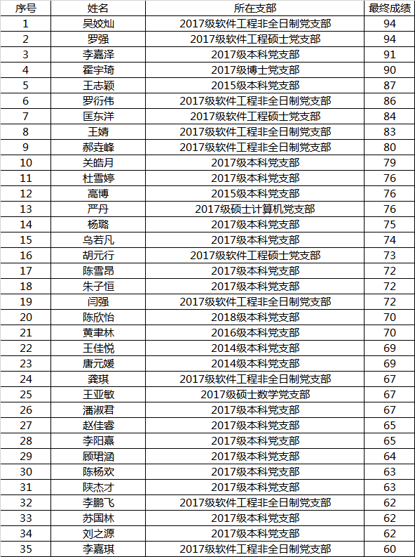 本期党校共有48人通过党校学员资格审查并参加院党校学习,最终35人成绩合格,现将通过名单公示如下。
