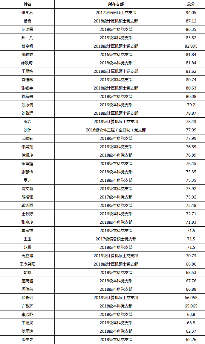 本期党课学习小组有51人报名。最后,经过综合评定及党总支委员讨论,40人通过党课学习小组,通过率为78.4%。
