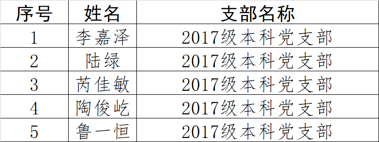 综合考虑本次各支部所推荐发展对象人选的综合素质、党群团组织推优和学院党委审查情况,按照《关于做好学校党校第37期学生(毕业生)发展对象培训班学员推荐工作的通知》,经充分讨论及前期公示,bat365在线平台登录党委拟向学校党校推荐5名学生参加第37期学生(毕业生)发展对象培训班学习。推荐学员名单如下: