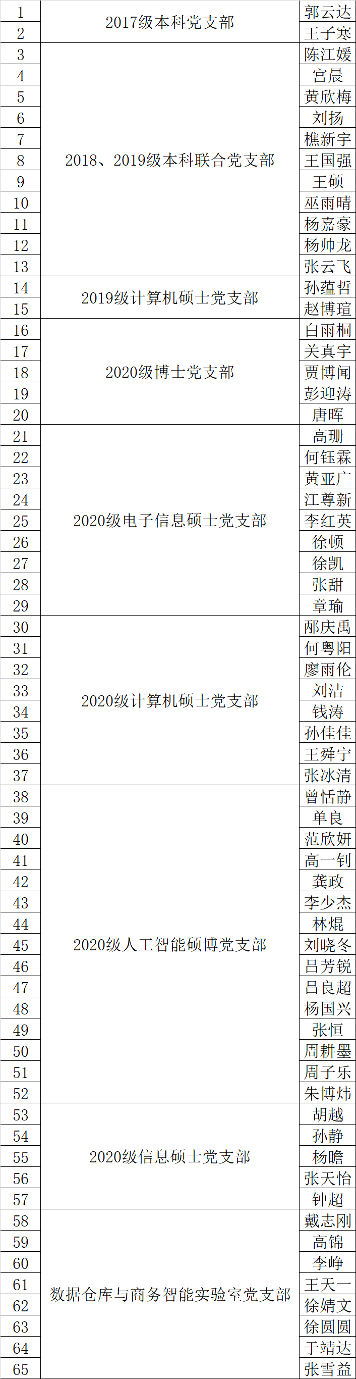 为认真贯彻发展党员工作“控制总量,优化结构,提高质量,发挥作用”的方针,进一步加强对发展党员工作的民主监督,严把发展党员“入口关”,提高学员培养质量,根据学校党委相关规定,现对已参加此次党课学习小组且单项、综合均考核合格的学员名单进行公示(各支部内部按姓氏首字母排序),以听取党内外群众意见。