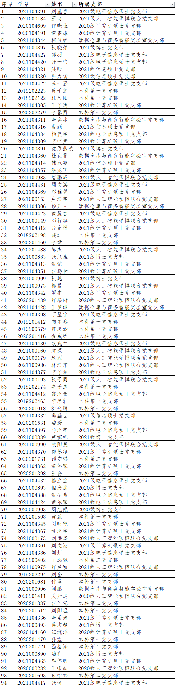 为认真贯彻发展党员工作“控制总量,优化结构,提高质量,发挥作用”的方针,进一步加强对发展党员工作的民主监督,严把发展党员“入口关”,提高学员培养质量,根据学校党委相关规定,现对已参加此次党课学习小组且单项、综合均考核合格的学员名单进行公示,以听取党内外群众意见。