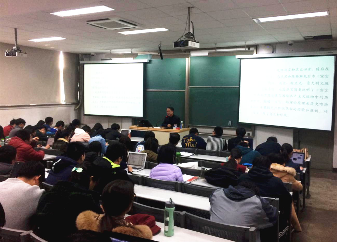 王向明教授为同学们简要剖析了《共产党宣言》的基本结构。引文中“幽灵”的说法反映了当时资产阶级对无产阶级的污蔑和围剿,同时也反映了当时无产阶级力量的弱小;第一章《资产者和无产者》论述了马克思主义的阶级斗争学说,提出“至今一切社会的历史都是阶级斗争的历史”;第二章《无产者和共产党人》说明了无产阶级政党的性质、理论和纲领,提到无产阶级的历史使命是“解放全人类”;第三章《社会主义和共产主义的文献》,批判了当时流行的各种假社会主义;第四章《共产党人对各种反对党派的态度》则论述了共产党人革命斗争的思想策略,对应的马克思主义中国化的方针即“农村包围城市,武装夺取政权”。