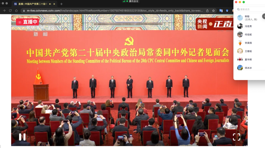 10月23日,刚刚在中国共产党第二十届中央委员会第一次全体会议上当选的中共中央总书记习近平和中共中央政治局常委李强、赵乐际、王沪宁、蔡奇、丁薛祥、李希在北京人民大会堂同中外记者亲切见面。习近平发表重要讲话。