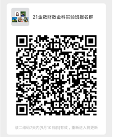 有意报名的同学请扫码进入微信群“2021金数财数金科实验班报名群”(仅限学生加入)。群内请使用实名(学院+姓名+学号)。按照指令填写报名表,进行线上报名。即日起开始报名,报名截止时间为2021年9月9日(周四)晚24:00。
