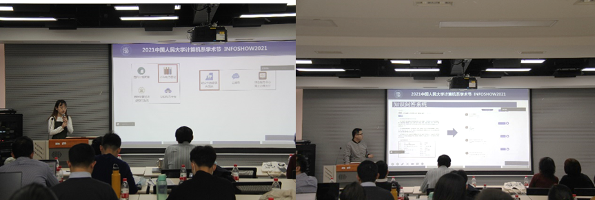 学术节上午是InfoShow 2021,来自计算机系的11位教师和19组系统团队展示了这一年的最新科研成果。学术节下午是“大数据治理”学术论坛,来自香港浸会大学、清华大学、浙江大学、矩阵起源公司的四位专家学者和杜小勇教授进行了学术讲座。