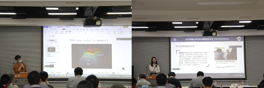 上午的Infoshow成果展示由柴云鹏教授和王永才副教授主持,文继荣院长在开场作了精彩的致辞。在教师成果分享环节中,赵素云、范举、李锡荣等11位教师分享了过去一年发表的优秀论文,论文涵盖机器学习、多媒体技术、网络数据挖掘、大数据管理、物联网、信息安全、区块链等多个领域,展示了计算机系教师和同学研究主题的深度和广度。