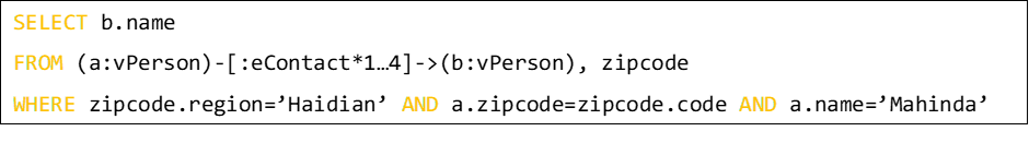 2.查询语言GRQL。我们在GRainDB中设计和实现了GRQL,在标准的SQL语法中集成了图查询语言的路径模式,路径模式可以出现在FROM子句中,同关系表的语义级别相同。例如,查找Mahinda通过1到4的变长路径接触过的在海淀地区的人的姓名。