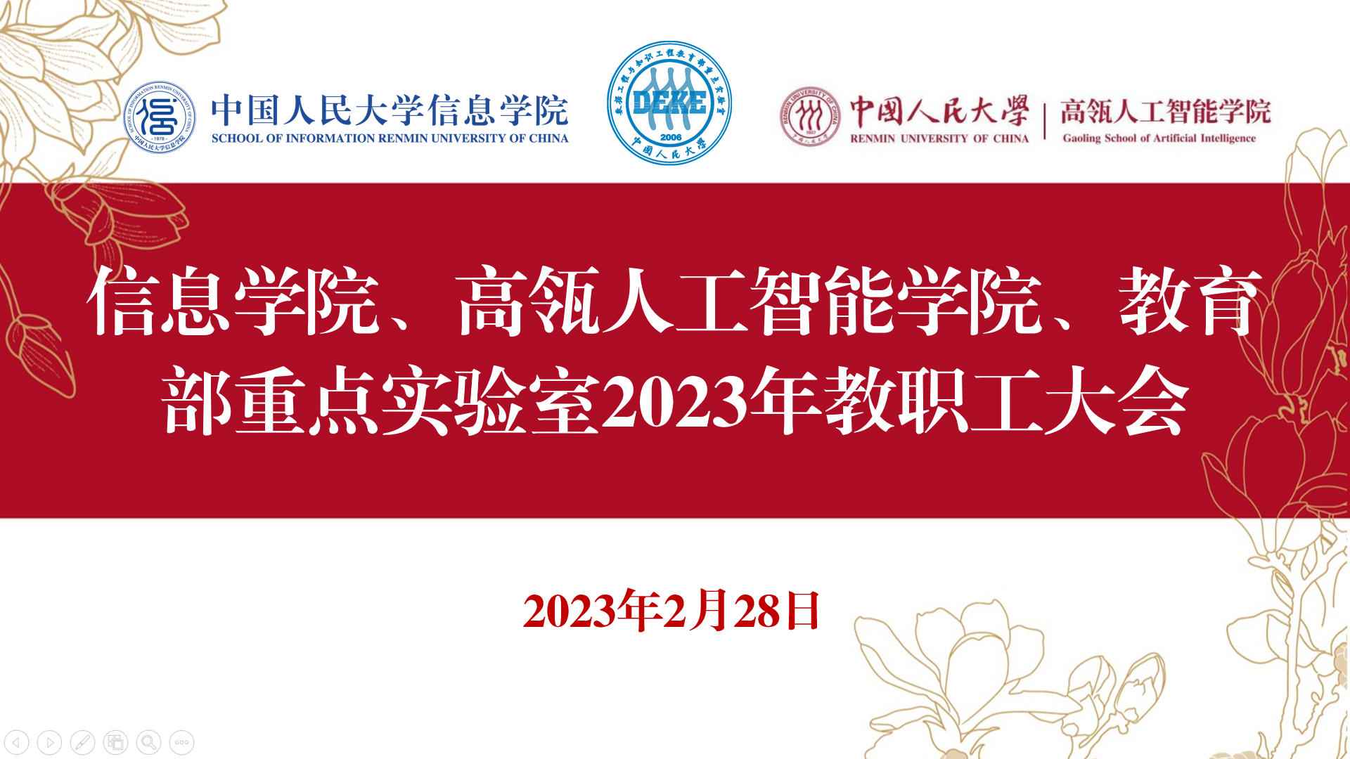 2023年2月28日中午,bat365在线平台登录、高瓴人工智能学院、数据工程与知识工程教育部重点实验室在信息楼四层报告厅联合举办新学期全体教职工大会。bat365在线平台登录、高瓴人工智能学院、重点实验室全体教职工参加,大会由bat365在线平台登录党委书记陈红主持。