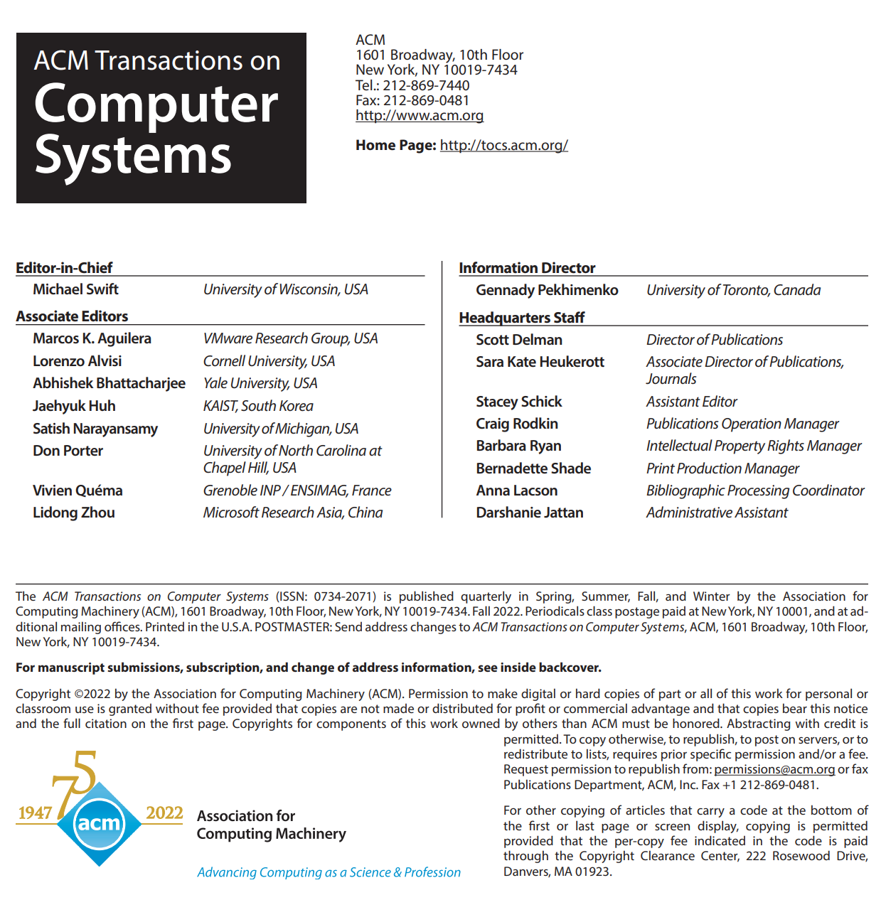 bat365在线平台登录赵捷老师的论文被计算机系统领域顶级期刊ACM Transactions on Computer Systems录用