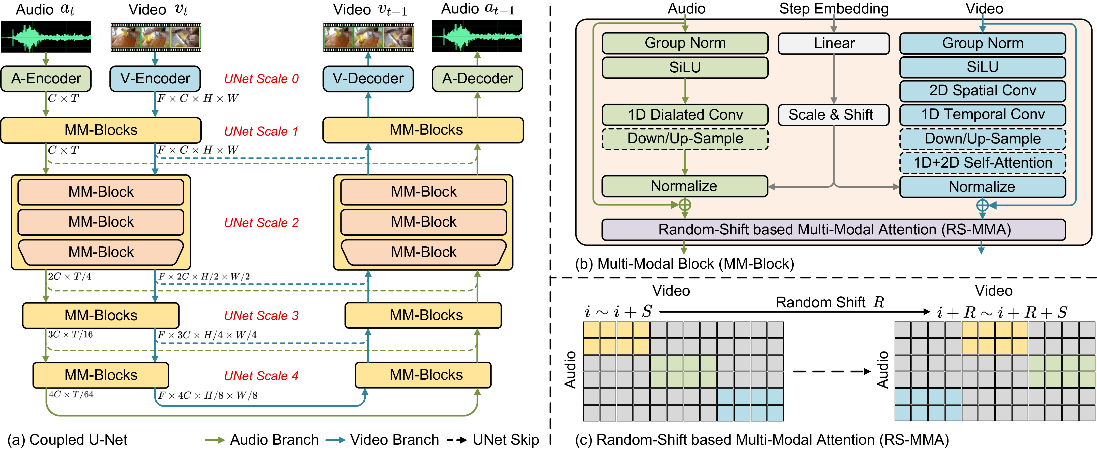 基于AI的智能创作已经在不同子领域得到了令人瞩目的成绩(图像生成、视频生成、音频生成),但是目前的工作主要聚焦在单模态内容生成上,考虑到不同模态间天然存在着对齐关系,本文提出了首个音-视频对生成模型Multi-Modal Diffusion (MM-Diffusion)。该模型由两支相对独立的U形子网络构成,一支用于视频建模、一支用于音频建模。为了高效建模音视频之间的时序对应关系,我们提出了基于随机偏移的Attention模块去桥接两个子网络。实验显示对比单模态生成,两个模态同时生成质量会更高。除此之外,我们的模型具备zero-shot 条件生成的能力(输入视频生成对应音频或反之)。我们为这个任务构建了Landscape数据集,并在客观指标、人工评测等角度在Landscape、AIST++两个数据集上衡量,实验结果均超过了之前可复现单模态生成的SOTA。