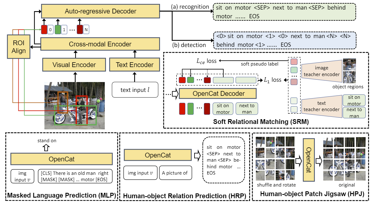 在现实生活中,有限的监督数据和海量交互组合之间的矛盾一直困扰着人-物交互检测任务(HOI)。当前的工作大多基于封闭类别集合数据训练得到,它们将HOI学习视为一个预先定义好类别词典的分类任务,利用一个分类器将输入图像映射成维度固定的logits,因此难以将这些方法扩展到新类别上。为了解决这个问题,我们提出了一个名为OpenCat的语言建模框架,它将预测HOI实例的过程重构为一个序列生成任务,通过采用序列化方案将每一个HOI三元组转换为令牌序列。按照这种做法,OpenCat能够利用语言建模框架具有开放集合词汇表的特点,以极高的自由度预测新的交互类别。此外,受到当前已有的视觉语言预训练模型的启发,我们从图像字幕对这样的数据中收集了大量弱标签,并提出了几个代理任务,包括掩码语言预测、人-物象关系预测、软关系匹配等等,用来辅助模型的预训练过程。大量实验表明,我们提出的OpenCat模型在数个HOI相关的评测数据集上都获得了显著的性能提升,尤其是在少样本和未见类别上。