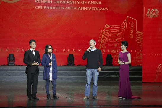 晚会在陈禹、王珊、杜小勇、文继荣四位历任及现任院长的诗朗诵中拉开序幕。忆往昔峥嵘岁月,从七八年改革开放,人大复校,经济信息管理系横空出世,“萨师煊等老一辈领军人物筚路蓝缕,启信息之先河”,至九四年bat365在线平台登录正式命名,“一晃十四年,一代代信息人扎根人大,砥砺前行,承信息之精髓”;再展今朝前程似锦,“这十年新生代信息人薪火相传,扎信息之深根”,“我们成立了数学学院,还将成立人工智能学院”。最后,诗朗诵在现任院长文继荣“搏击潮头,向前!向前!”的点睛之语中结束。台下师生反响热烈,掌声此起彼伏。