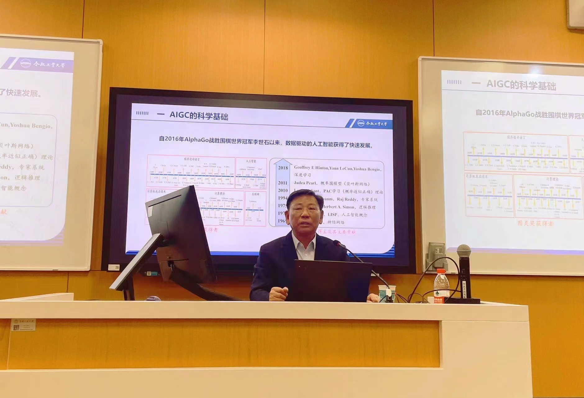 杨善林院士报告主题为《AIGC的科学基础及应用展望》,向参会的师生分享介绍AIGC的发展历程、科学基础、技术实现、领域应用以及安全治理等内容。杨院士首先介绍了从GPT-1、GPT-2、GPT-3、GPT-3.5到GPT-4、GPT-4V的发展历程,然后介绍了近几十年在人工智能领域作出突出贡献的图灵奖得主及其主要贡献,从1969年Marvin Minsky提出的神经网络,到1971年人工智能概念的提出,再到逻辑推理、专家系统、PAC理论、概率图模型以及深度学习等概念,结合AlphaGo、Transformer模型等具体案例,将AIGC的发展脉络进行详细的阐述。