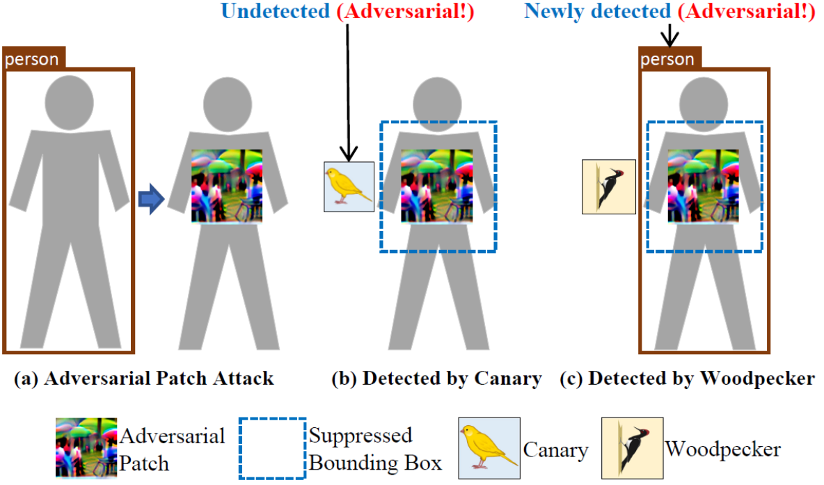 论文简介:近年来,目标检测模型已广泛应用于自动驾驶、视频监控等各类现实任务中。然而,这类模型容易受到对抗性补丁攻击,包括隐藏攻击和误分类攻击。如何保护目标检测模型免受对抗性补丁攻击,已成为一个重要且紧迫的研究课题。本文在人工智能安全攻防中引入软件安全防御思想,提出了一种全新的防御方法,采用在输入中引入防御性补丁的方式检测对抗补丁攻击。我们提出了两种防御补丁,Canary和Woodpecker,分别用于探测对抗补丁的存在和抵消对抗补丁的攻击效果。并通过实施随机注入策略,保证了方法的鲁棒性。实验表明所提出方法能有效检测未知的攻击方法和defense-aware的攻击方法,时间开销小,且不用修改原始目标模型。本文方法为对抗补丁防御提供了一种全新的、有效的方案。