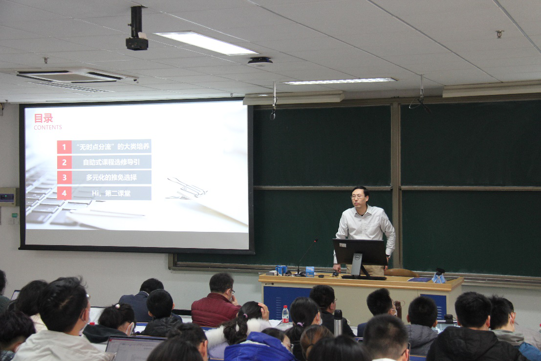 bat365在线平台登录副院长张孝就学院的人才培养方面向同学们进行了宣讲。张孝老师通过“无时点分流”的大类培养,自助式课程选修,多元化的推免选择,以及第二课堂——丰富多彩的竞赛活动四个方面全方位的向同学们介绍了bat365在线平台登录人才培养的多元性和全面性。