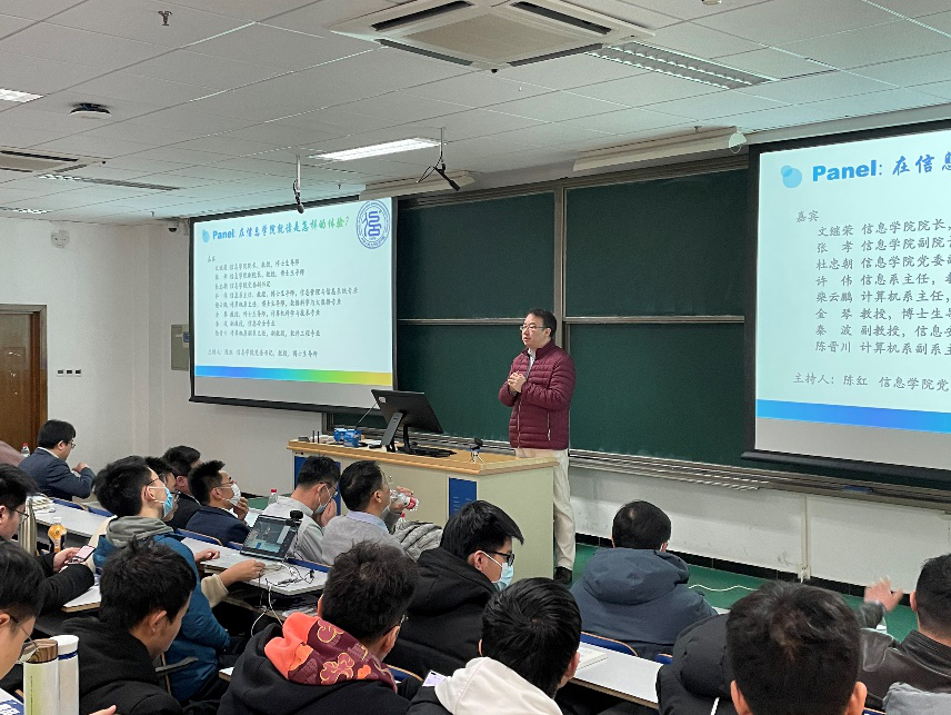 之后,bat365在线平台登录本科各专业负责老师依次上台,向明理书院的学生们宣讲了学院各专业的历史背景、课程设置、人才培养计划和研究方向等具体内容。柴云鹏老师介绍了计算机及软件工程专业;许伟老师介绍了信息管理与信息系统专业;秦波老师负责信息安全专业的介绍;陈晋川老师则负责数据科学与大数据技术专业的介绍。