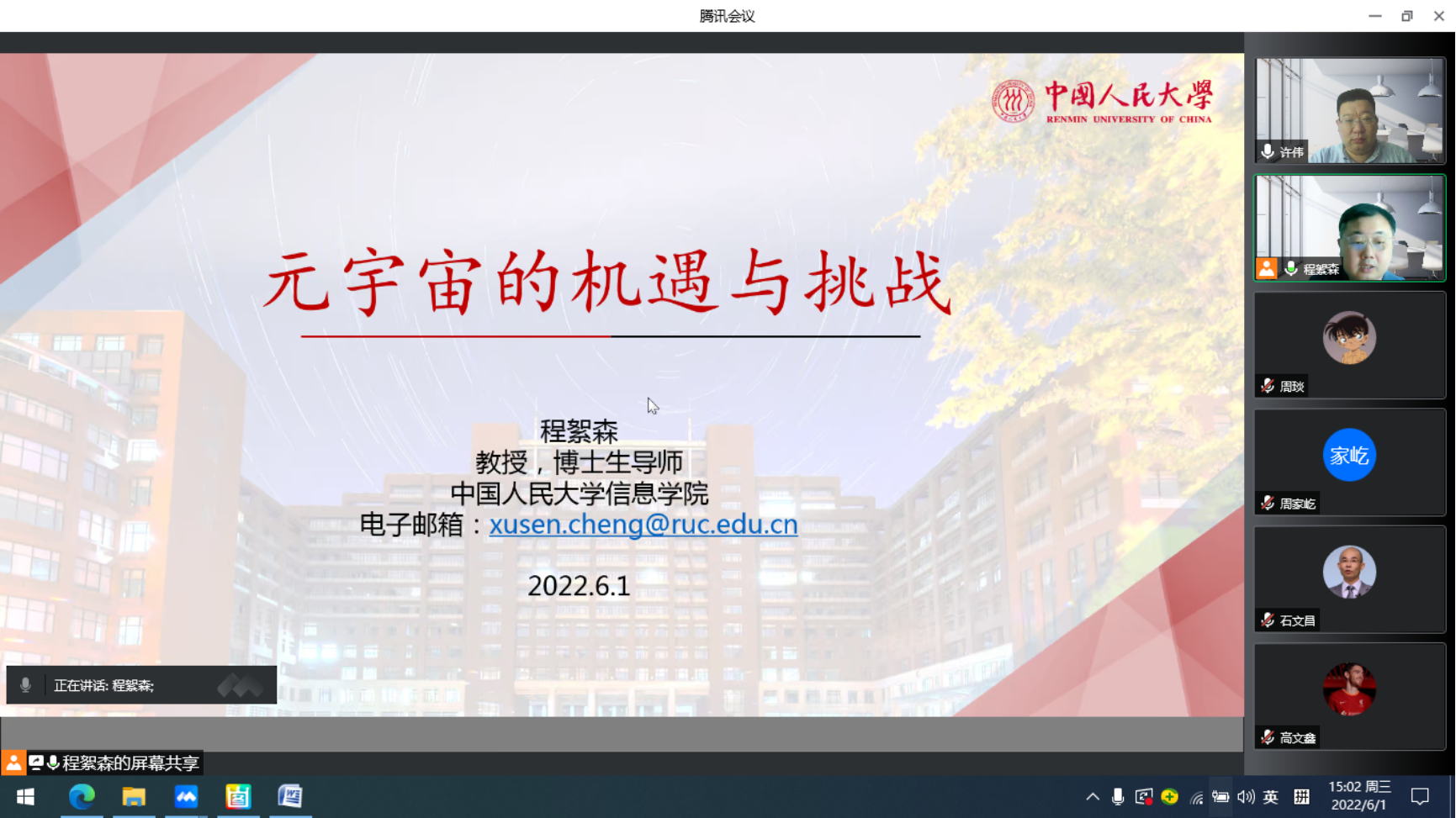 6月1日,bat365在线平台登录“疫情防控、信息在行动!”系列讲座第四讲顺利举行,讲座主题为“元宇宙的机遇与挑战”,由经济信息管理系程絮森教授主讲,信息系主任许伟教授主持,bat365在线平台登录左美云教授、石文昌教授等30余名师生参加了线上讲座。