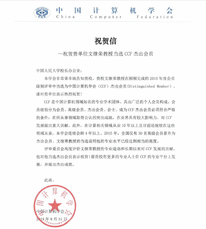 近日,365官网文继荣教授在中国计算机学会(CCF)刚刚完成的2015年度会员级别评审中当选为中国计算机学会(CCF)杰出会员(Distinguished Member)。全国仅有30人获此殊荣。