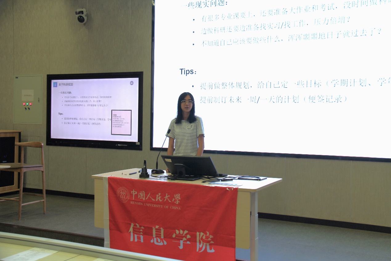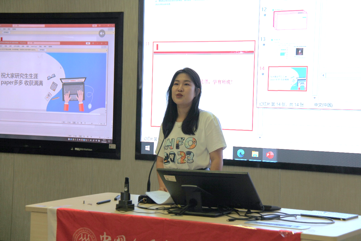 研究生代表2021级硕士生陈炜婧同学回顾了自己的科研经历,向同学们讲述了自己在科研中遇到的难题、解决办法、心路历程以及收获,并向同学们分享了几个实用的科研小工具。