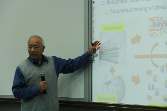 随后,数据挖掘领域的顶尖学者,伊利诺伊大学厄巴纳-香槟分校的韩家炜教授带来了“From Unstructured Text to Textcube: Automated Construction& Multidimentional Exploration”的报告。Jiawei Han教授主要从将非结构化的文本转化为结构化的Network以及Cube的角度介绍目前的最新的研究进展,重点介绍了实体与关系的抽取,以及词嵌入方面结合局部与全部语义的一些新思考。Jiawei Han教授认为从大量无标签以及弱标签的数据中自动挖掘知识是目前研究的一个重要挑战。