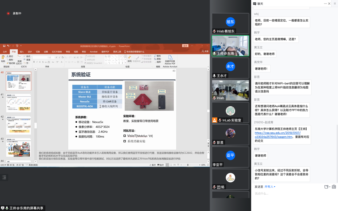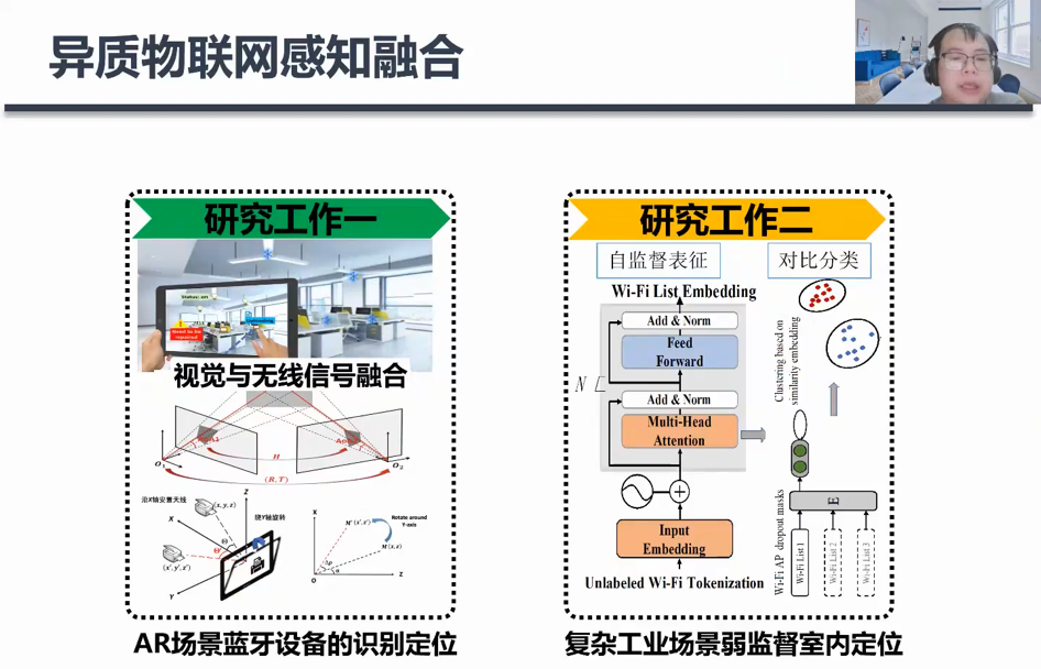 王帅教授以物联网技术将引领未来信息产业发展为背景,主要介绍了异质物联网多模态融合感知与计算。首先,针对异质物联网场景视觉和无线信号间的模态壁垒,提出视觉和无线信号融合的人机可视化交互技,该技术基于AoA寻向定位和视觉检测信息进行跨模态融合匹配,实现室内AR场景下蓝牙设备的识别定位。其次,面向大规模环境复杂的工业场景,提出基于深度表征学习的弱监督室内定位技术,针对数据标注不准、不足等挑战,融合预训练无标签Wi-Fi白监督表征和深度对比学习,实现大规模端到端室内位置推断。
