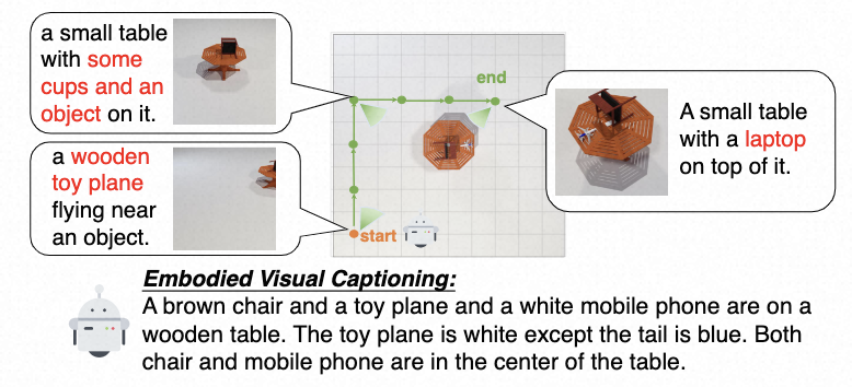 视觉描述模型已经取得了不错的效果。为了充分描述一个场景,他们需要输入一个拍摄角度较好且捕捉到大部分信息的图片或视频。然而,在现实场景中,一张图或一段视频可能不能完美得包含场景中所有的关键信息。在这种情况下,被动接受输入的视觉描述模型就不能提供有效的场景描述。为了克服这样的限制,我们提出使得视觉描述模型具备自主探索环境的能力,设计了一个新颖且有挑战性的任务——“Embodied Captioning”(具身视觉描述)。具体来说,从一个3D场景的随机一个视角点出发,智能体需要在环境中自主探索以收集不同视角下拍摄的视觉信息,最后生成一个详细的段落描述来提到场景内所有的物体、属性以及位置关系,如图1。