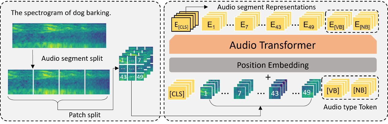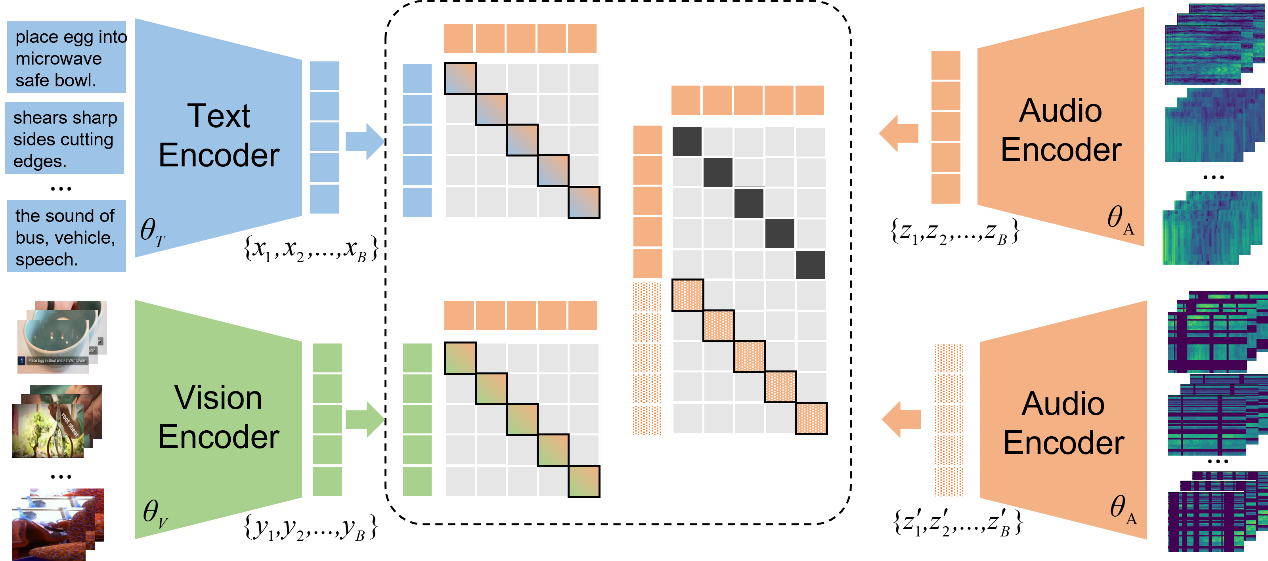 本文工作旨在利用已有的视觉-文本预训练模型(CLIP),将其扩展到音频模态,用来加强下游视频理解的相关任务(视频检索、视频文本描述)。传统的音频预训练工作由于处理音频时间过短、提取音频信息单一,无法直接引入进行跨模态建模。针对CLIP的模型特点和训练特点,本文采用CLIP的图像编码器作为音频编码器,首先转化音频为语谱图序列,输入编码器得到音频的序列特征。在音频编码器的训练上,我们同时采用模态间和模态内部的对比学习,对齐音频模态与其他模态,提升编码器音频信息抽取能力。此外,通用视频中的音频同时包含语义信息和非语义信息,我们在音频编码器最后引入[VB],[NB]两个token,用语义信息为主的视频数据集Howto100M、非语义信息为主的视频数据集Audioset分别训练。我们的方法在多个数据集的视频检索、视频描述生成中都获取了显著提升,超过了原来的SOTA。