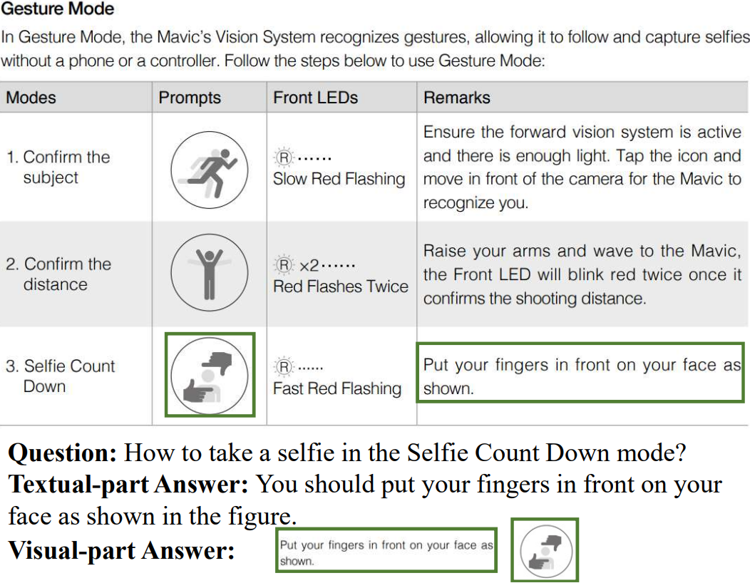 视觉信息对于在产品说明书的理解起十分关键的作用。现有的产品说明书问题回答(PMQA)任务只考虑了说明书中的文本内容,忽略了诸如产品图片和图例等视觉信息。该工作中我们提出了多模态产品说明书问题回答任务(MPMQA)。对于每个问题,MPMQA要求模型处理多模态说明书内容,并给出多模态的回答。我们通过人工标注构建了PM209数据集以支持MPMQA任务,PM209数据集由209份产品说明书构成,涵盖27种常见电子产品品牌。PM209将说明书的每一页划分为6种语义区域,并根据内容标注了共计22021个问题-回答对。每个问题的回答由文本回答(自然语言句子)和视觉回答(相关视觉区域)构成。由于说明书通常由多个页面构成,而问题往往只与部分页有关,MPMQA任务可以分为两个子任务:检索问题相关页和生成多模态回答。我们基于多任务学习,提出了可以完成上述两个子任务的统一URA模型,实验表明统一的URA模型能够与多个单任务模型表现相当。