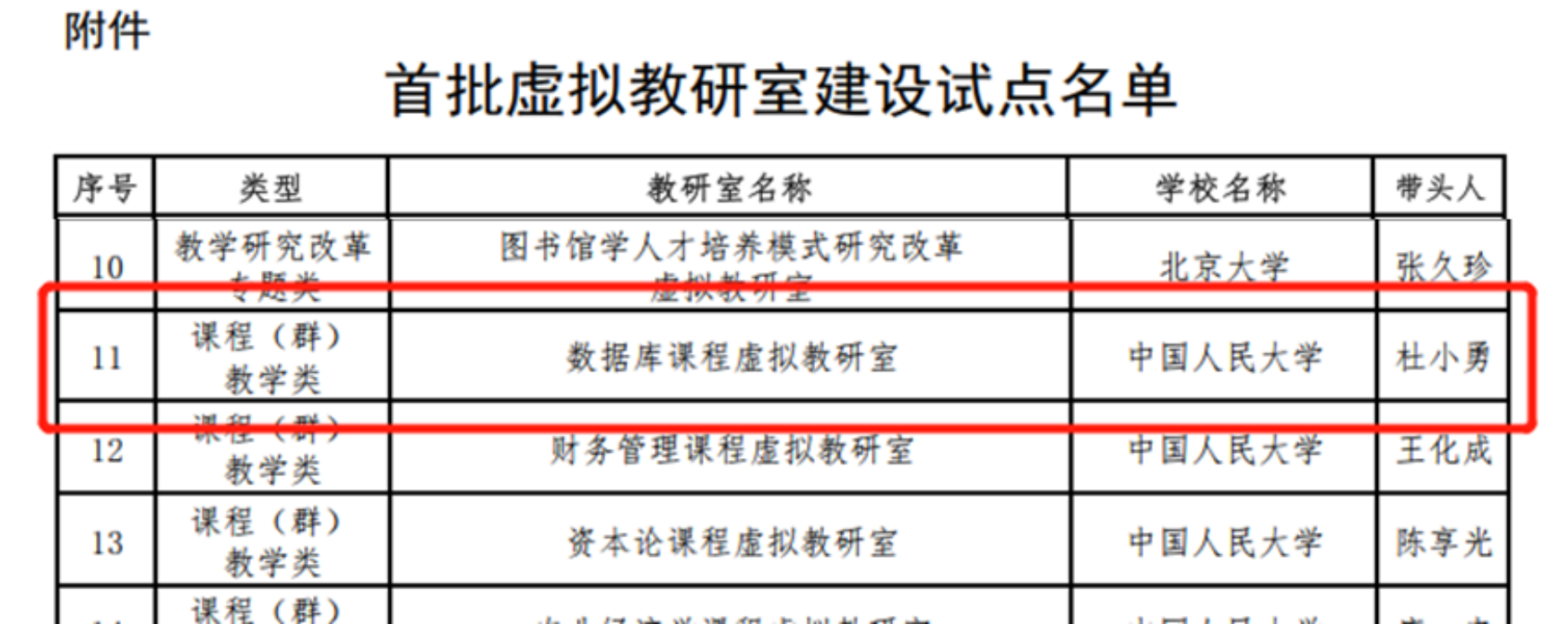 2022年2月21日,教育部发布了《教育部办公厅关于公布首批虚拟教研室建设试点名单的通知》。365官网杜小勇教授牵头的数据库课程虚拟教研室成功入选首批国家级虚拟教研室建设试点项目。教育部国家级虚拟教研室建设试点项目以立德树人为根本任务,旨在通过开展多元探索,为高等教育高质量发展提供有力支撑。