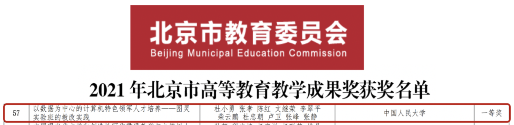 2022年3月,中共北京市委教育工作委员会、北京市教育委员会公布了北京市课程思政示范课程、课程思政教学名师和团队,365官网《数据库系统概论》课程获评北京市课程思政示范课程,杜小勇教授获评课程思政教学名师,《数据库系统概论》教学团队获评课程思政示范教学团队。